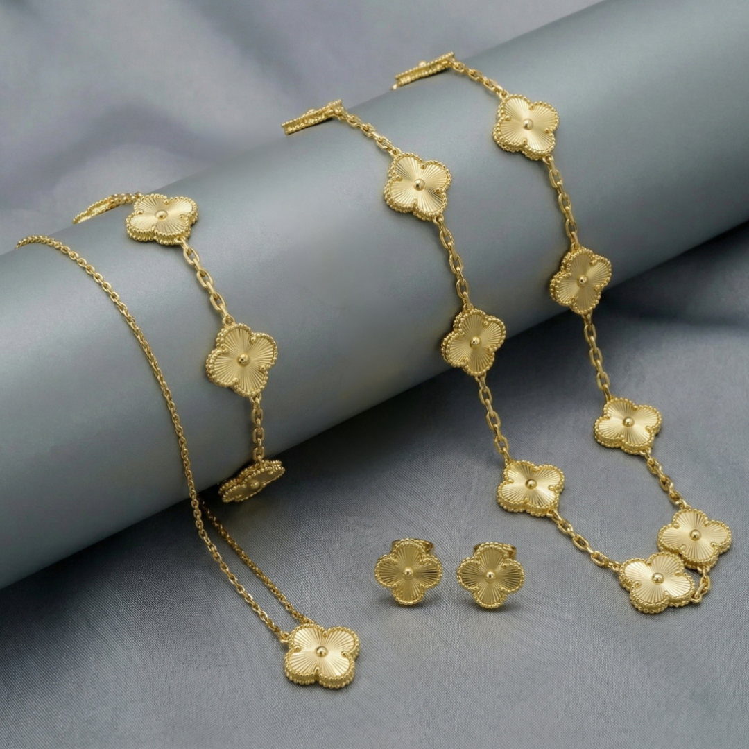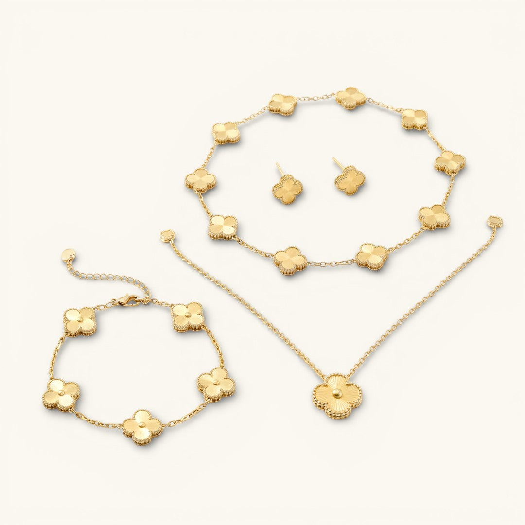 Embrace luck and elegance with Clover Set, a stunning four-piece jewelry set designed to elevate your everyday style. This refined collection features: