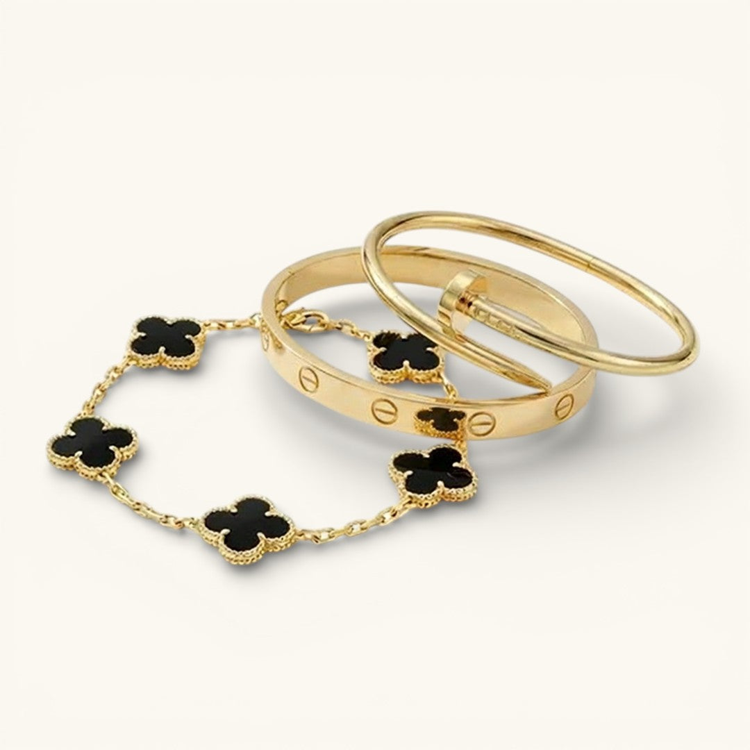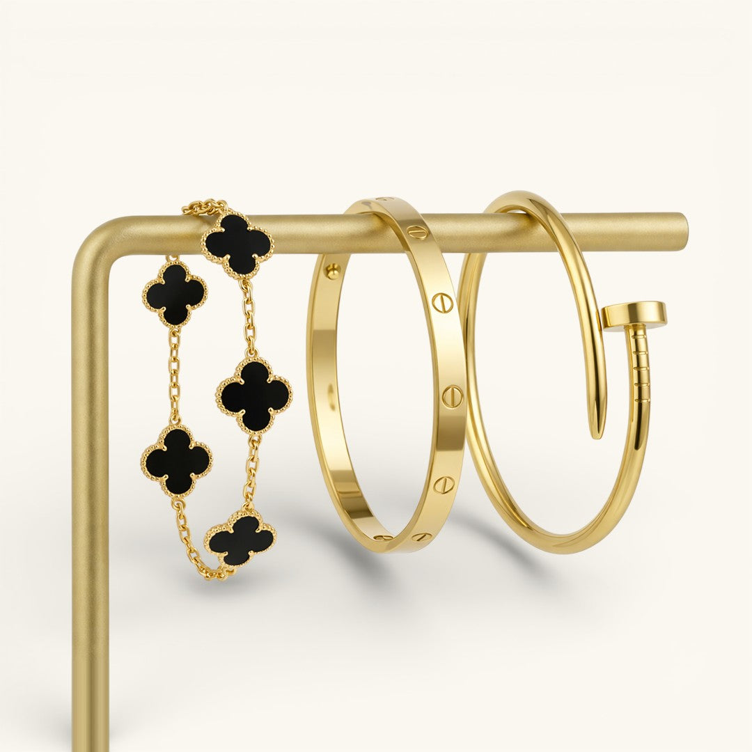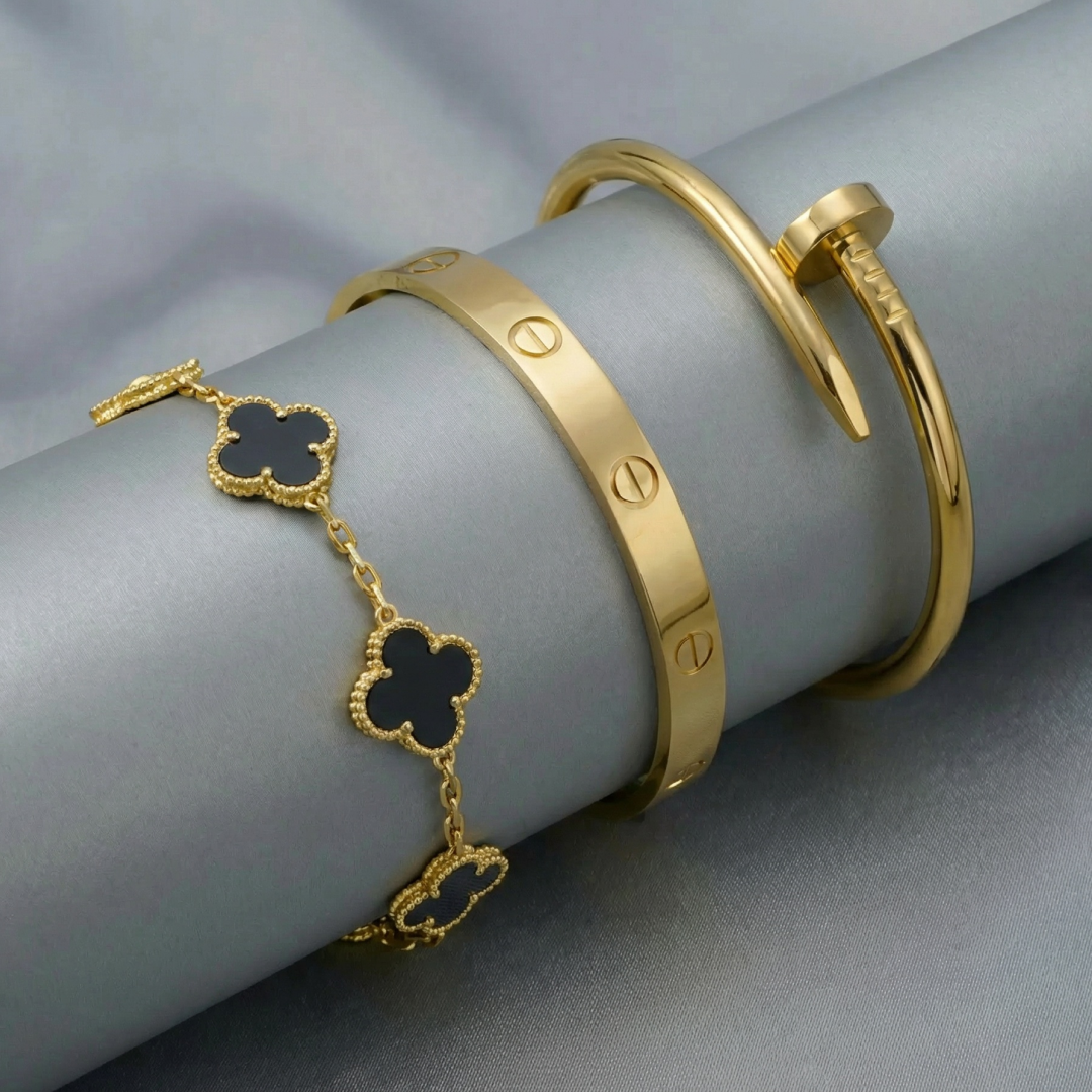• Trinity & Clover Bracelet: A delicate and adjustable bracelet (16+5 cm) with charming details, available in gold or silver.