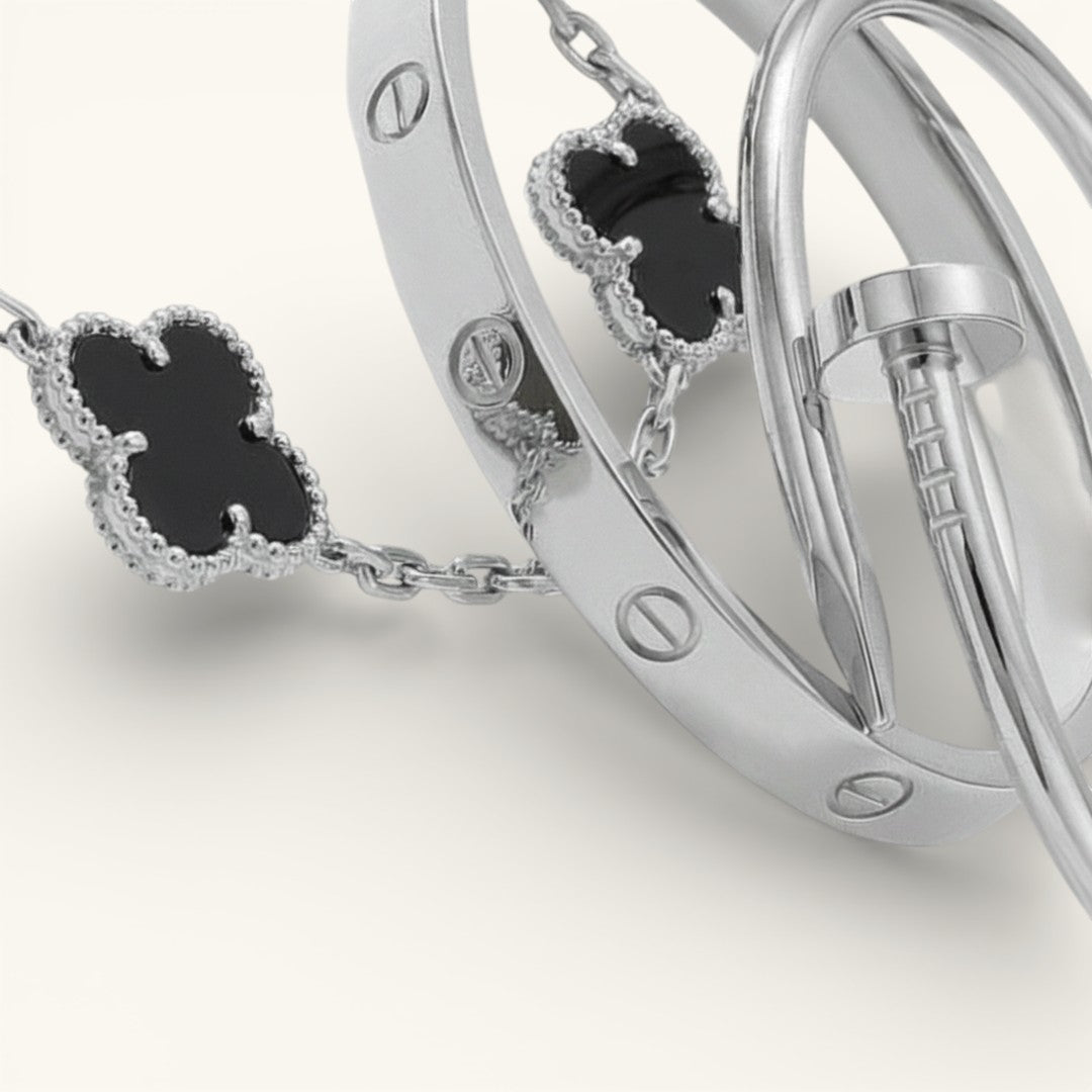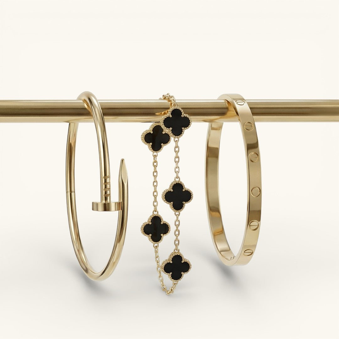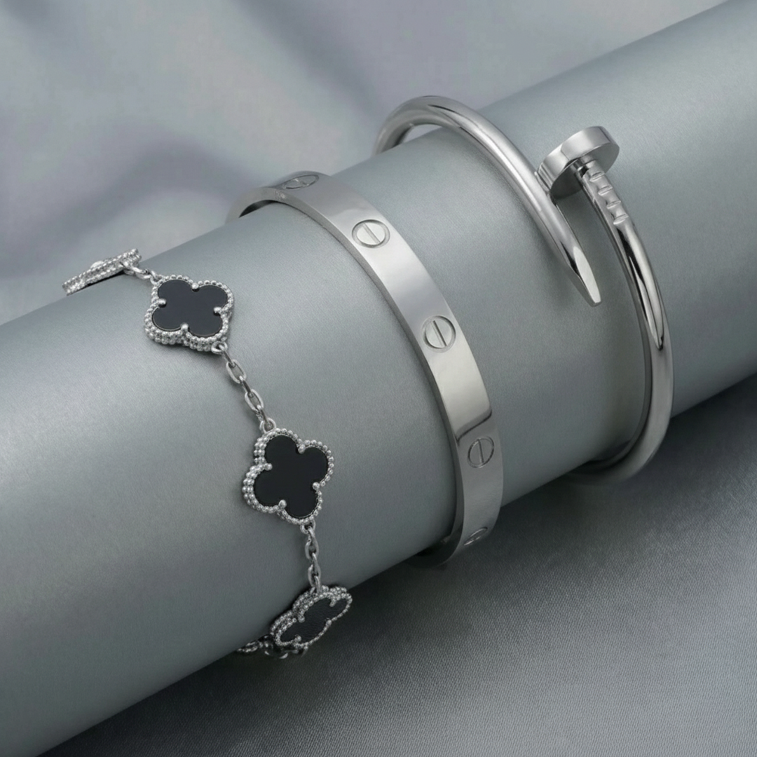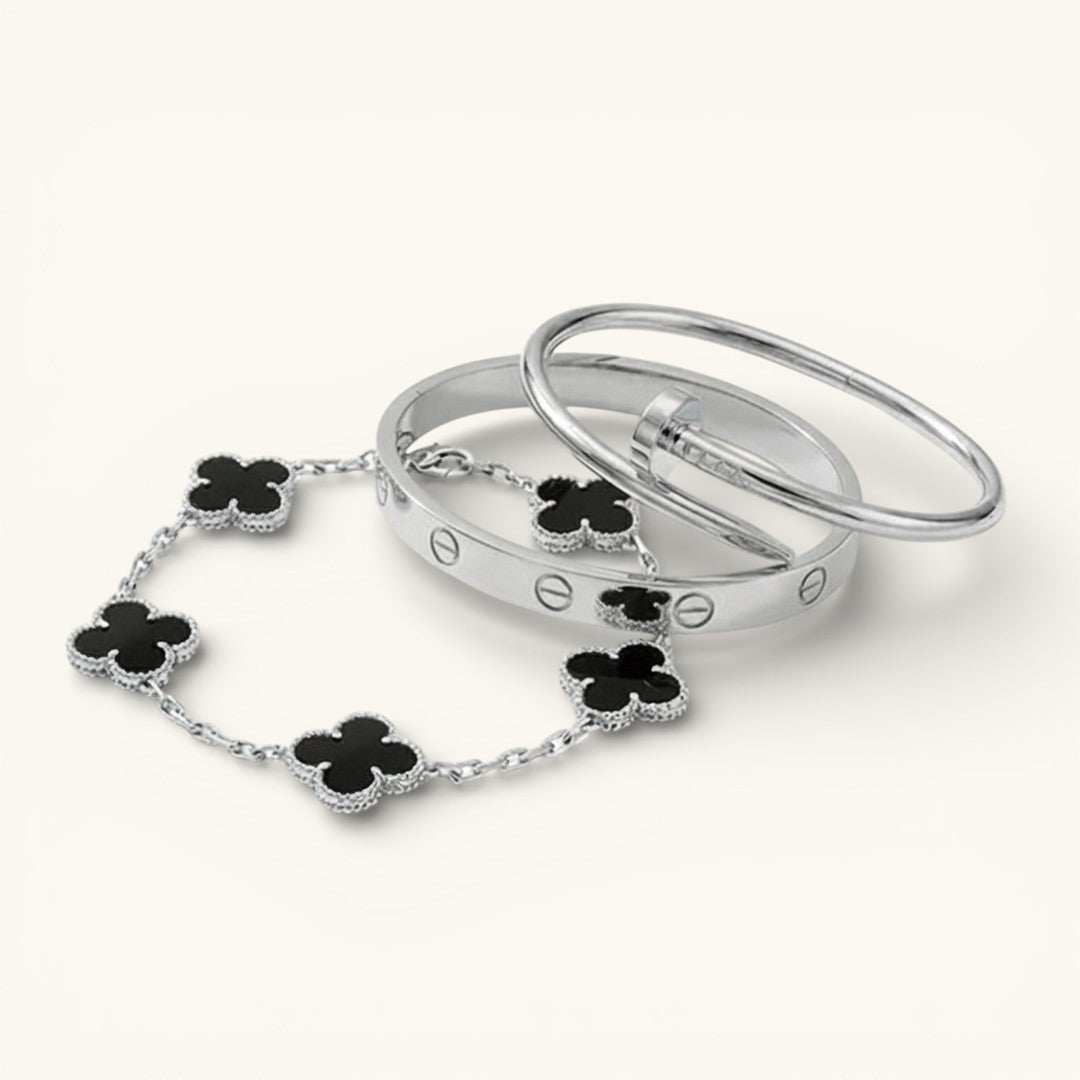 • Trinity & Clover Bracelet: A delicate and adjustable bracelet (16+5 cm) with charming details, available in gold or silver.